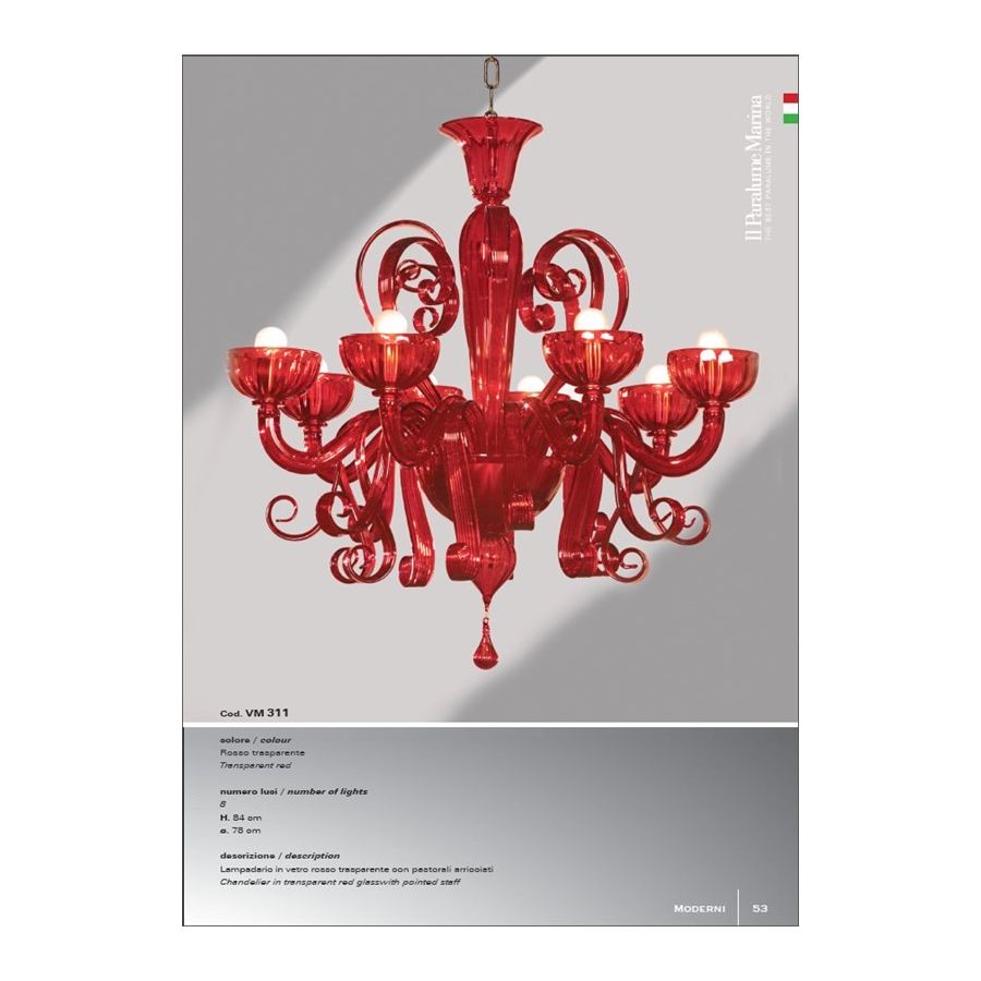 8 lights chandelier in transparent red glass with curled pastorals. Lighting fixture that diffuses the light into the surrounding environment with great effect, creating a warm and welcoming atmosphere.