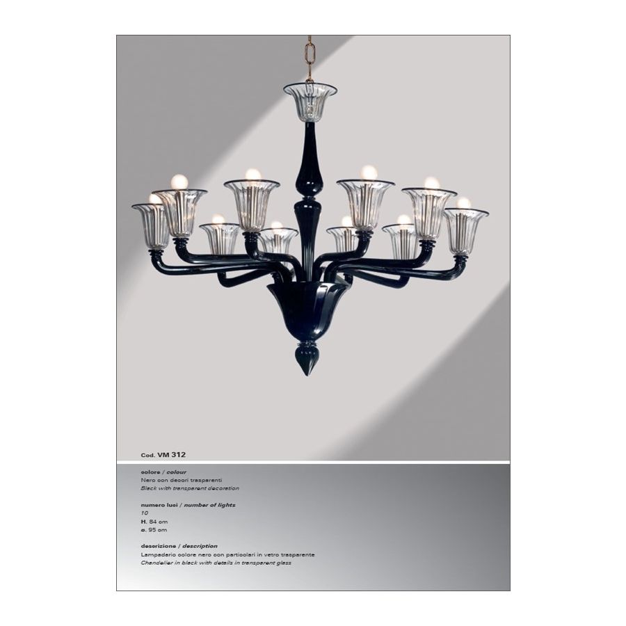 Black chandelier with transparent glass details, 10 lights. Lighting fixture that diffuses the light into the surrounding environment with great effect, creating a warm and welcoming atmosphere.