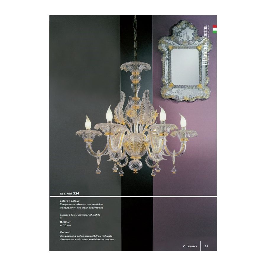 6 lights transparent chandelier with pure gold decoration. Lighting fixture that diffuses the light into the surrounding environment with great effect, creating a warm and welcoming atmosphere.