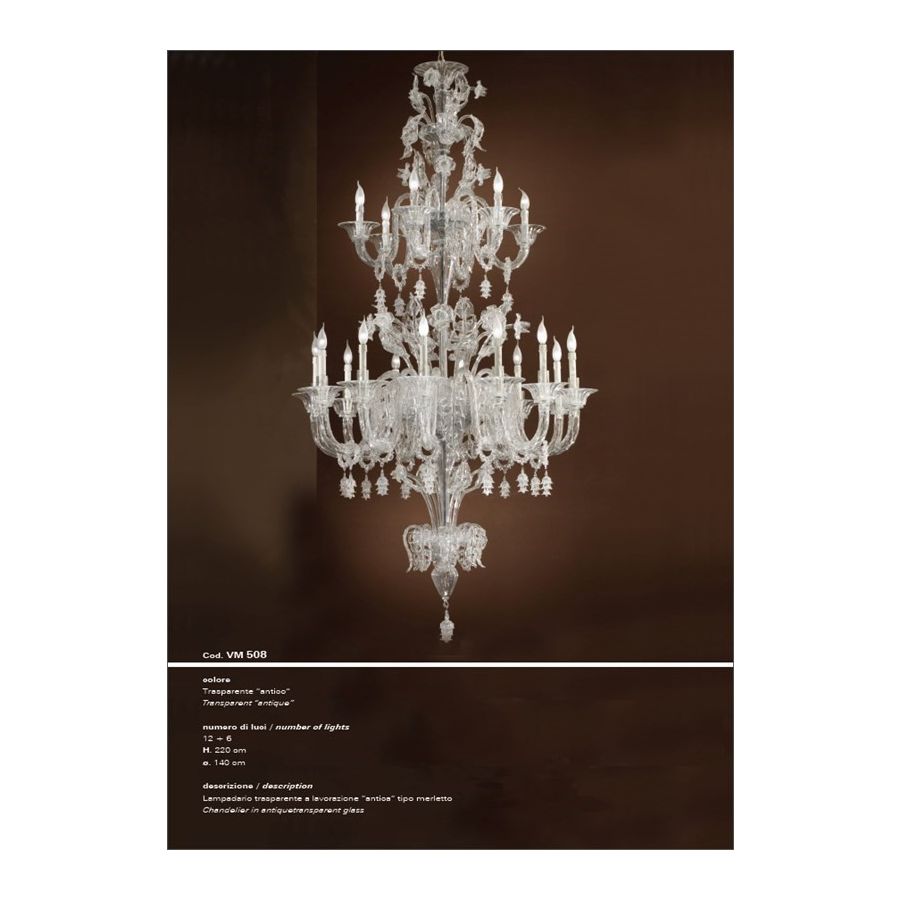 Transparent chandelier with "ancient" lace-like workmanship, 12+6 lights. Lighting fixture that diffuses the light into the surrounding environment with great effect, creating a warm and welcoming atmosphere.