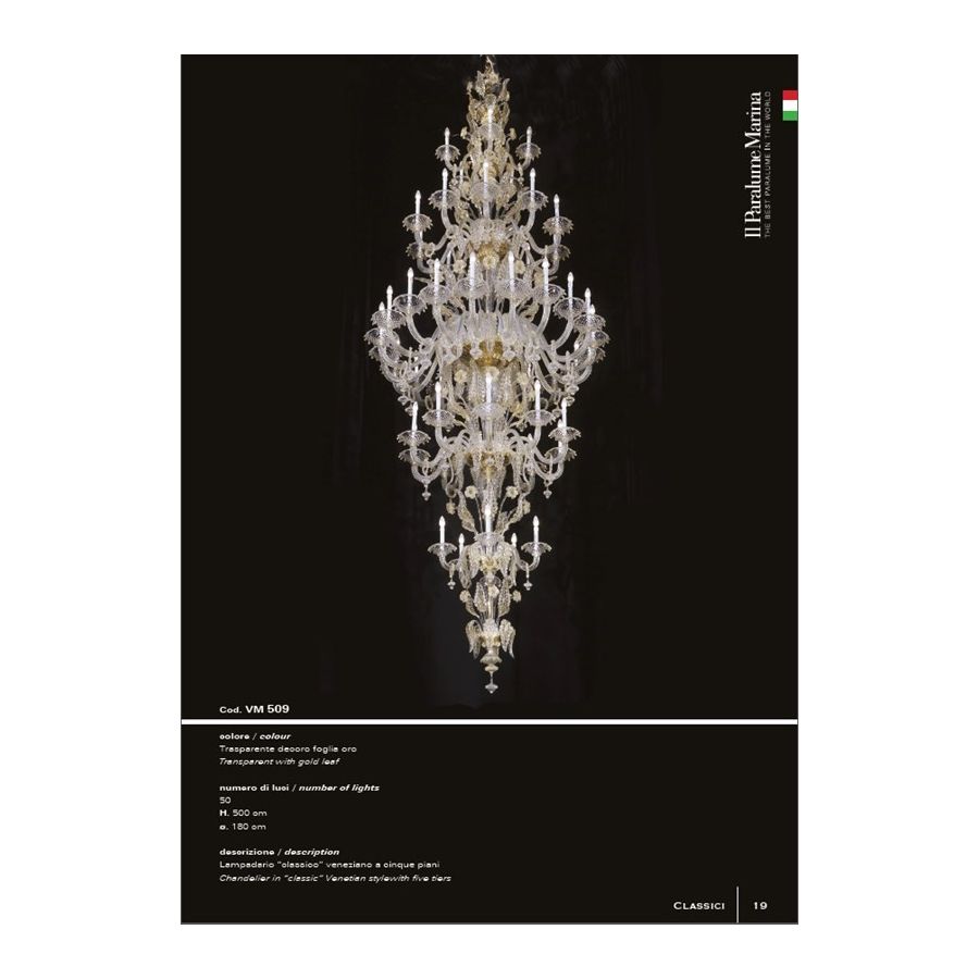 "Classic" Venetian chandelier with five floors, 50 lights. Lighting fixture that diffuses the light into the surrounding environment with great effect, creating a warm and welcoming atmosphere.