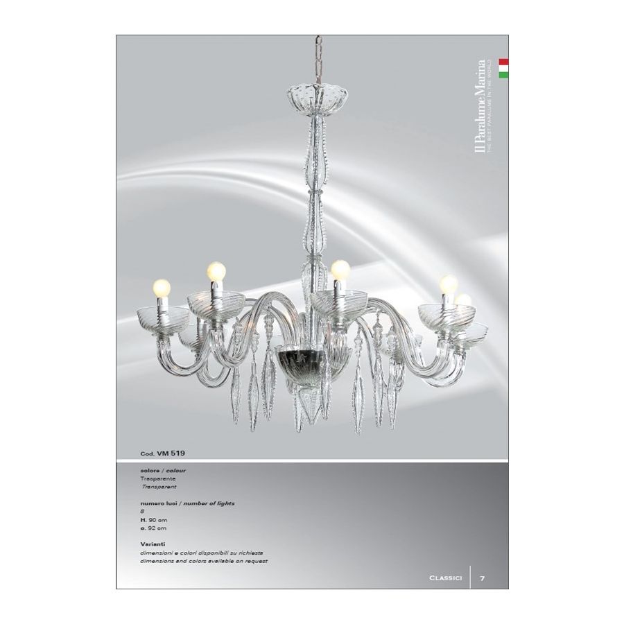 8 lights transparent chandelier. Lighting fixture that diffuses the light into the surrounding environment with great effect, creating a warm and welcoming atmosphere.
