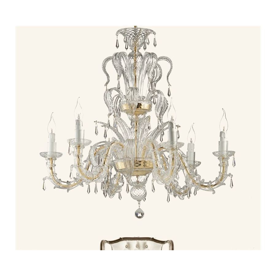 Murano Glass chandelier all transparent with Asfour® pendents. Lighting item that diffuses the light with great effect in the surrounding environement creating a warm and welcoming atmosphere.