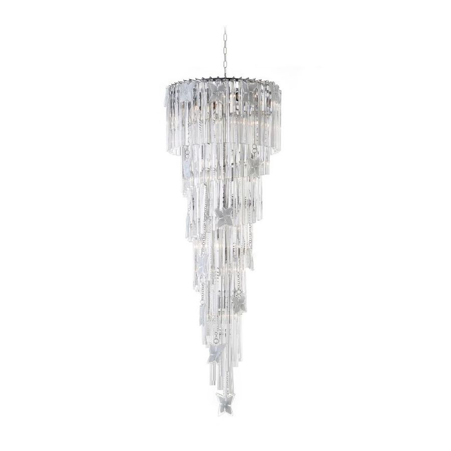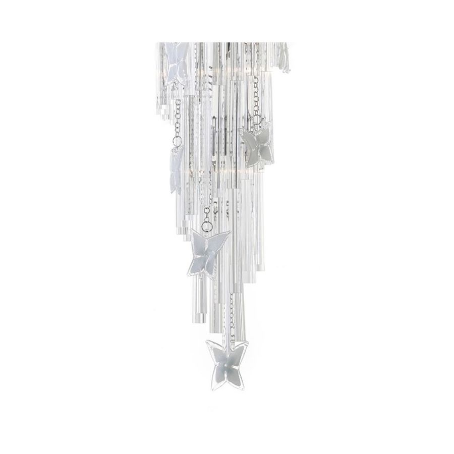 Chandelier with transparent triedri and white and trasparent butterfly all Murano glass. Lighting item that diffuses the light with great effect in the surrounding environement creating a warm and welcoming atmosphere.