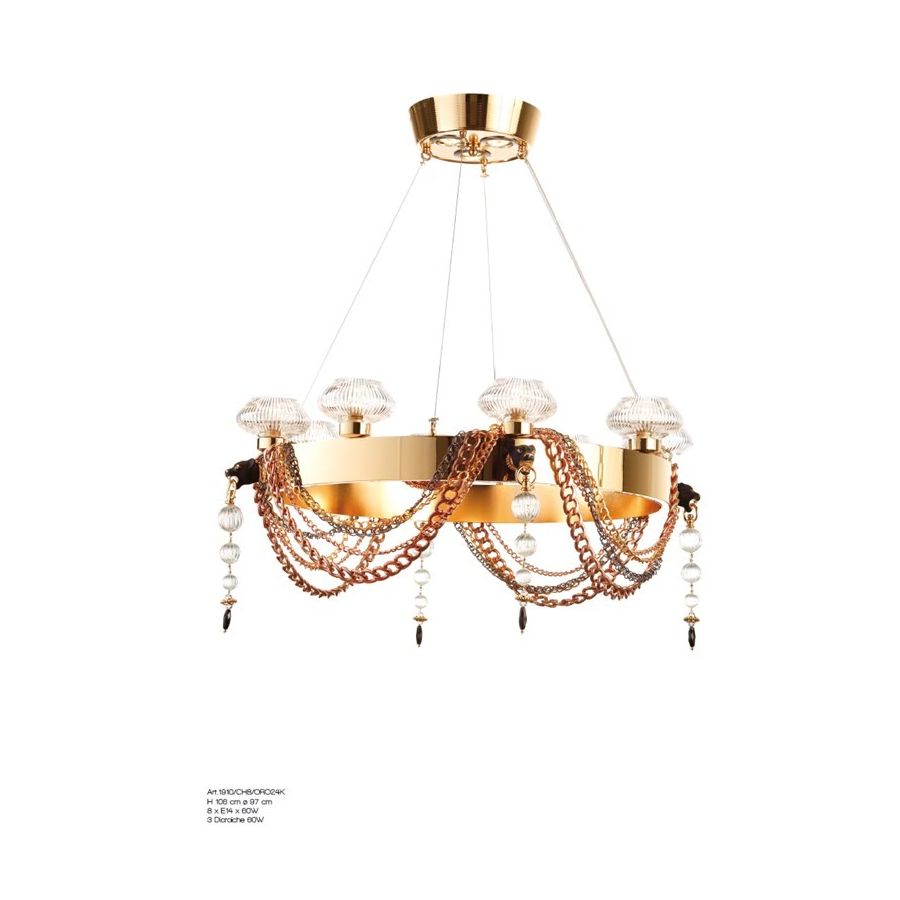 Chandelier 8 lights with panthers and chains ORO 24K. Lighting item that diffuses the light with great effect in the surrounding environement creating a warm and welcoming atmosphere.