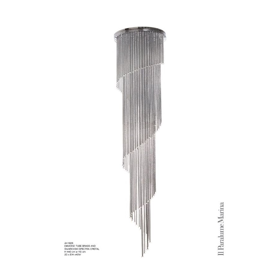 Cascade Chandelier in diamond cut brass tubes with Asfour® crystals. Lighting item that diffuses the light with great effect in the surrounding environement creating a warm and welcoming atmosphere.