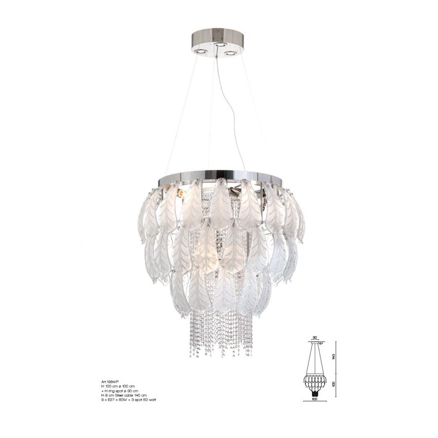 Chandelier with Murano glass leaves frosted effect. Lighting item that diffuses the light with great effect in the surrounding environement creating a warm and welcoming atmosphere.