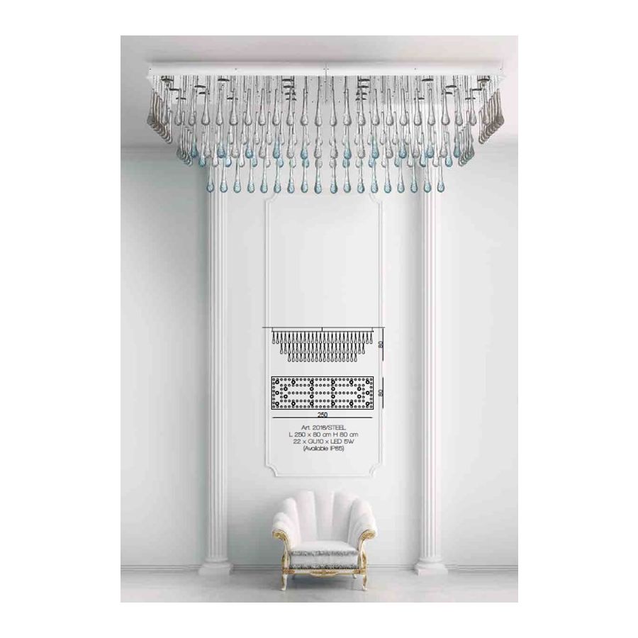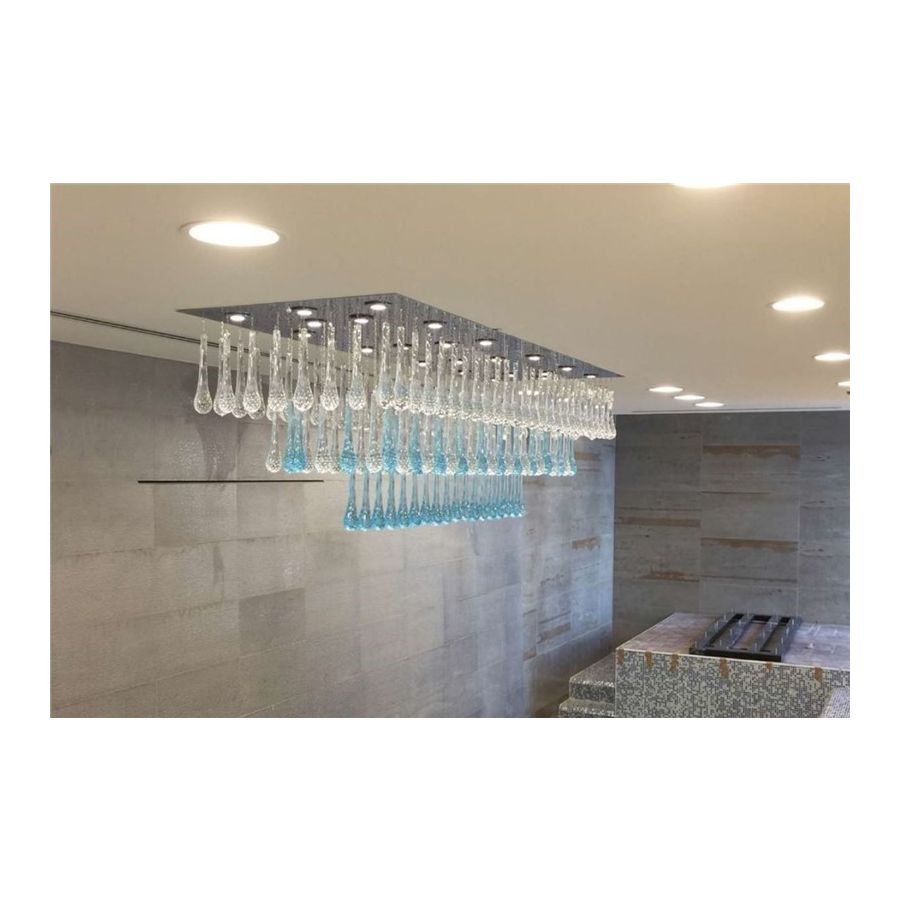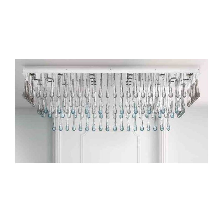 Steel Ceiling lamp with transparent and light blue Murano Glass drops (Available IP65). Lighting item that diffuses the light with great effect in the surrounding environement creating a warm and welcoming atmosphere.