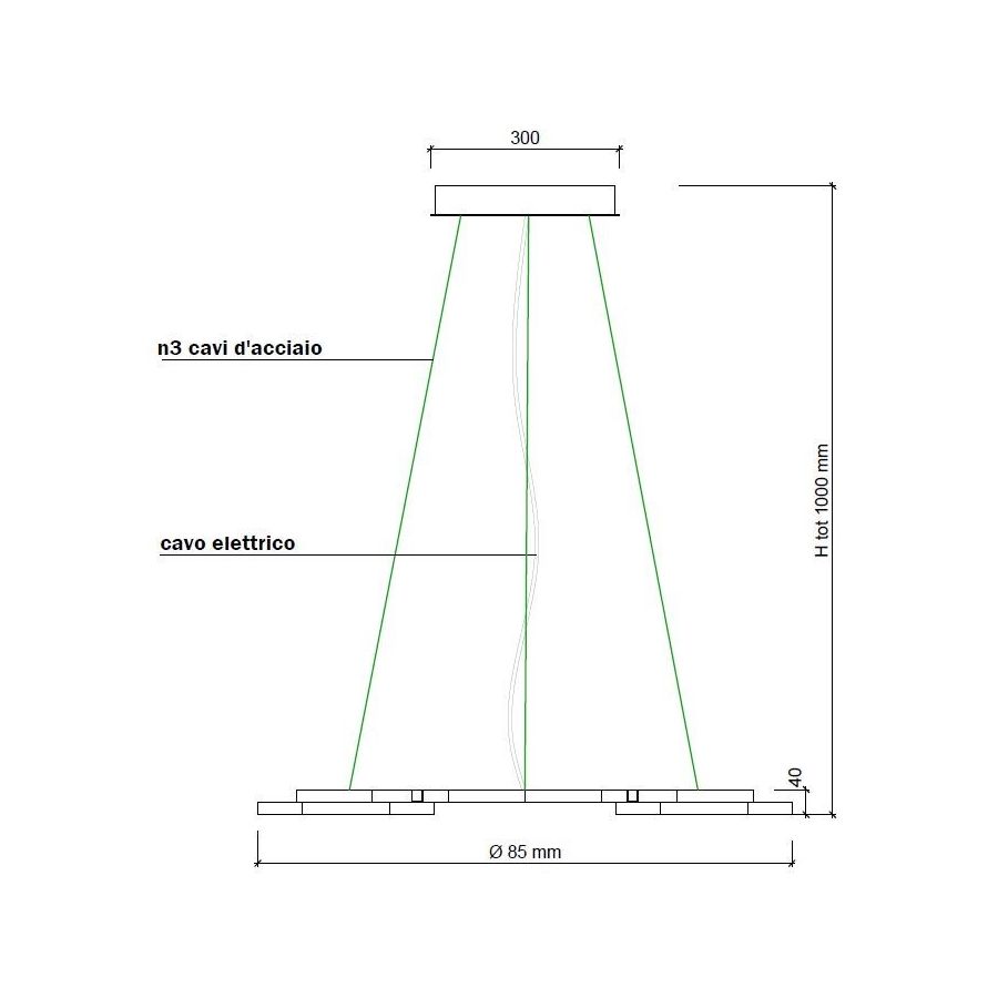 Steel cable: 95 cmBulbs: Strip led 19,2w/m 24v 3000°K 46W 3750 lumen