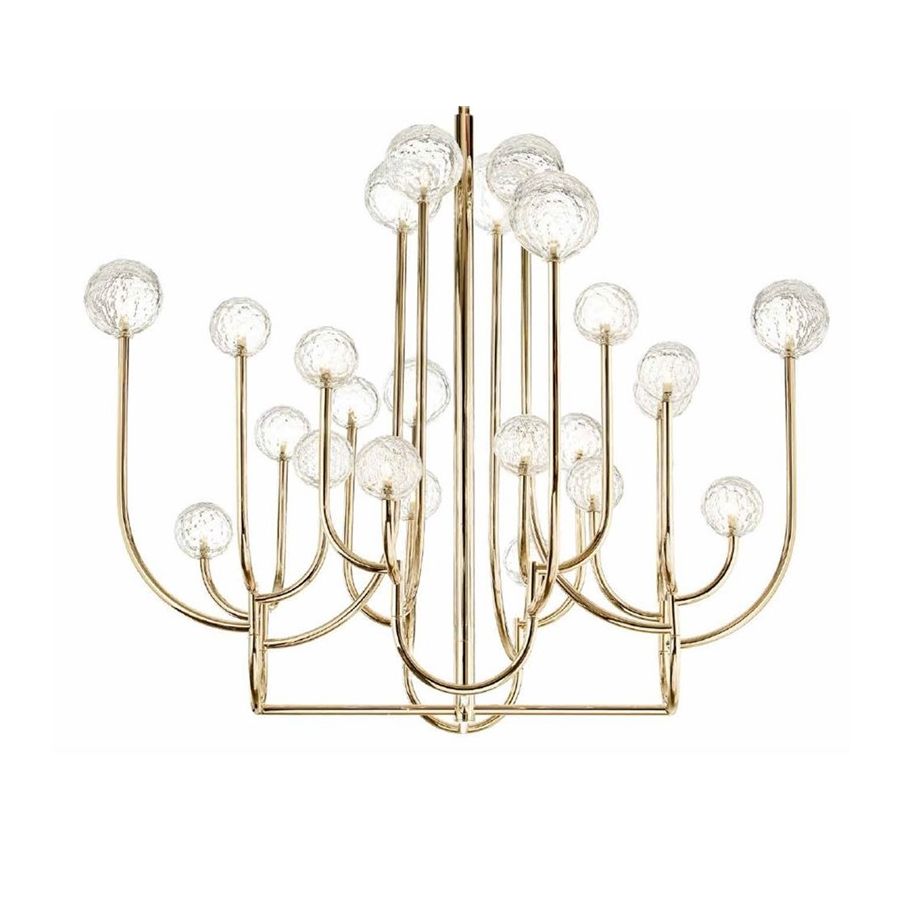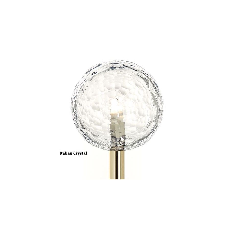 Chandelier in soft gold finish with hand-cut Italian crystal spheres. Lighting item that diffuses the light with great effect in the surrounding environement creating a warm and welcoming atmosphere.