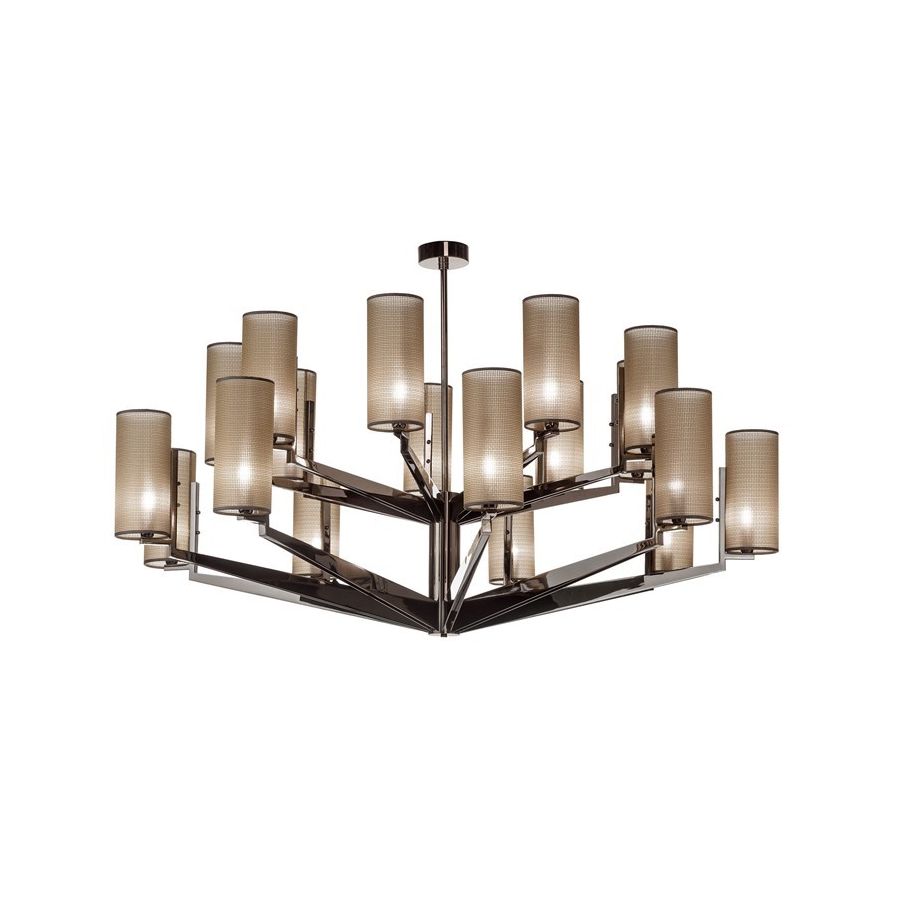 Chandelier in black nickel with fabric lampshades. Lighting item that diffuses the light with great effect in the surrounding environement creating a warm and welcoming atmosphere.