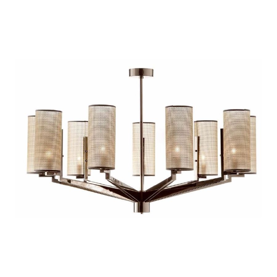 Chandelier in black nickel with fabric lampshades. Lighting item that diffuses the light with great effect in the surrounding environement creating a warm and welcoming atmosphere.
