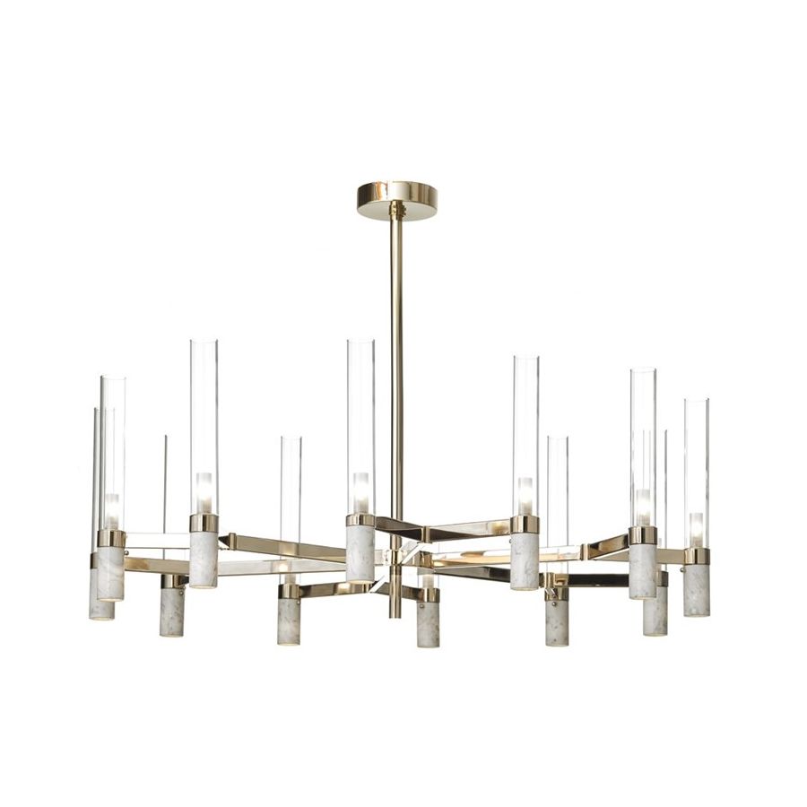 Chandelier with grey veined Carrara marble and borosilicate glass. Lighting item that diffuses the light with great effect in the surrounding environement creating a warm and welcoming atmosphere.