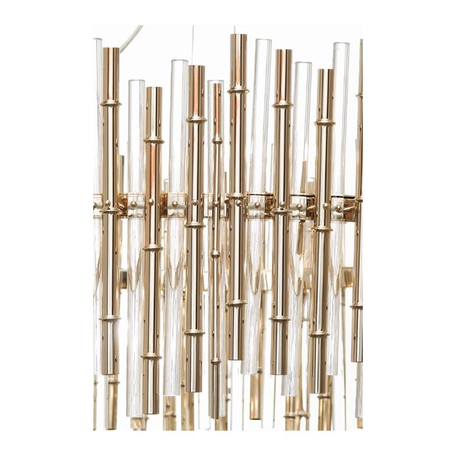 Chandelier in glass and brass elements in the shape of bamboo. Lighting item that diffuses the light with great effect in the surrounding environement creating a warm and welcoming atmosphere.