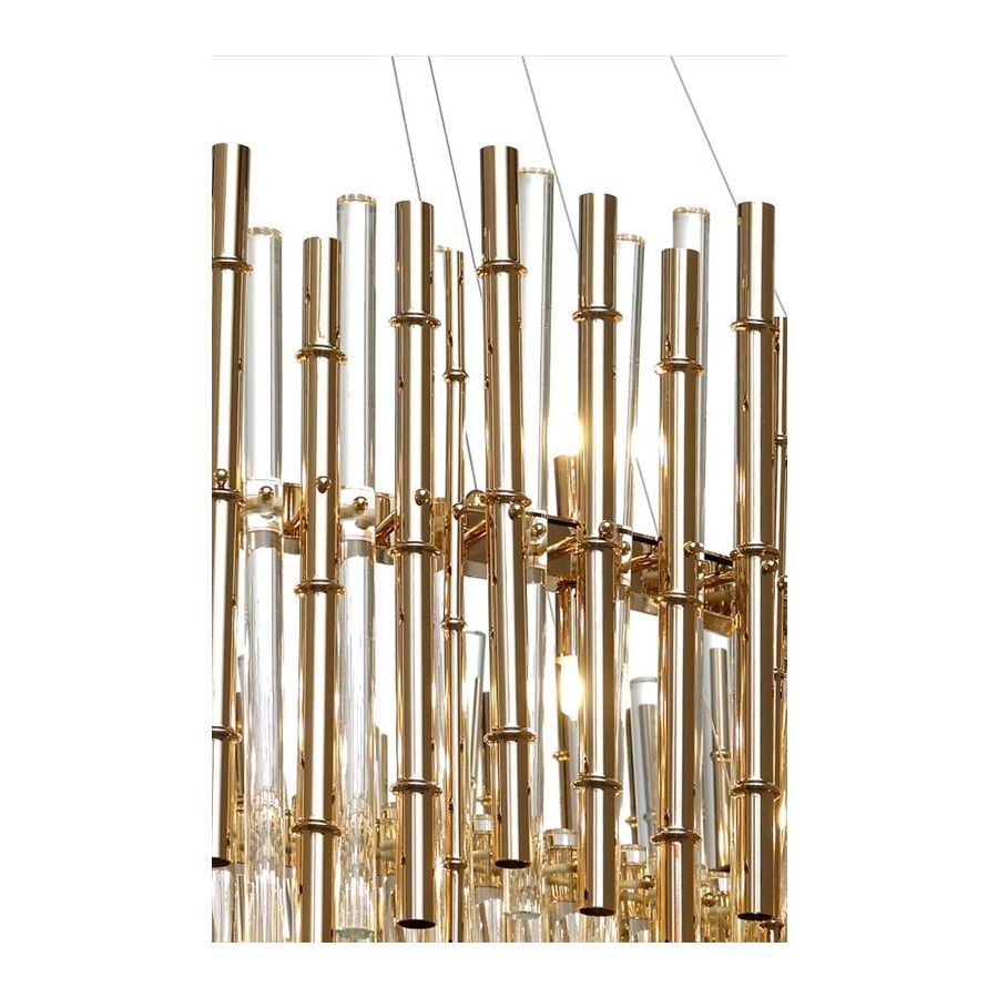 Chandelier in glass and brass elements in the shape of bamboo. Lighting item that diffuses the light with great effect in the surrounding environement creating a warm and welcoming atmosphere.
