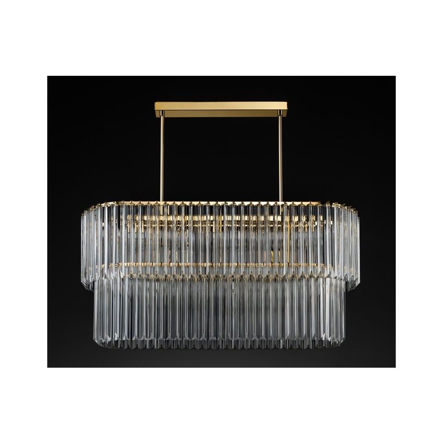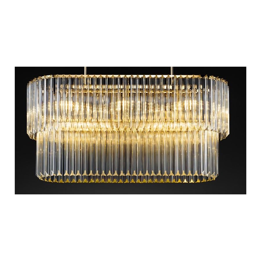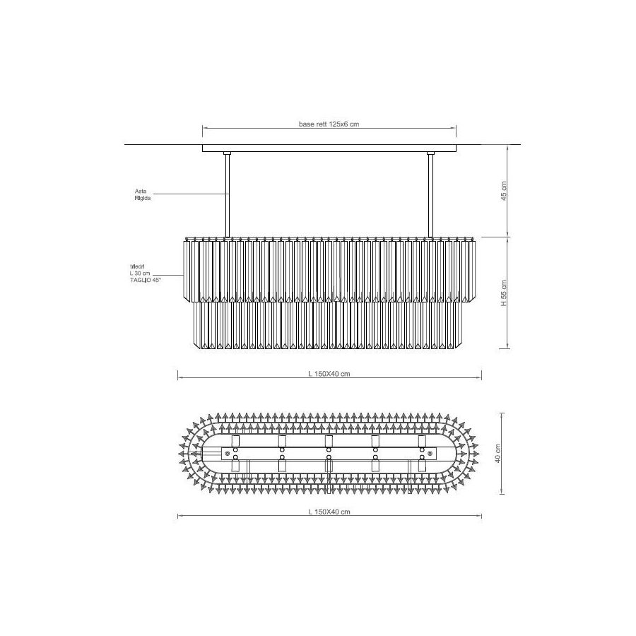Oval chandelier with brunito metal structure and clear thriedron glass. Lighting item that diffuses the light with great effect in the surrounding environement creating a warm and welcoming atmosphere.