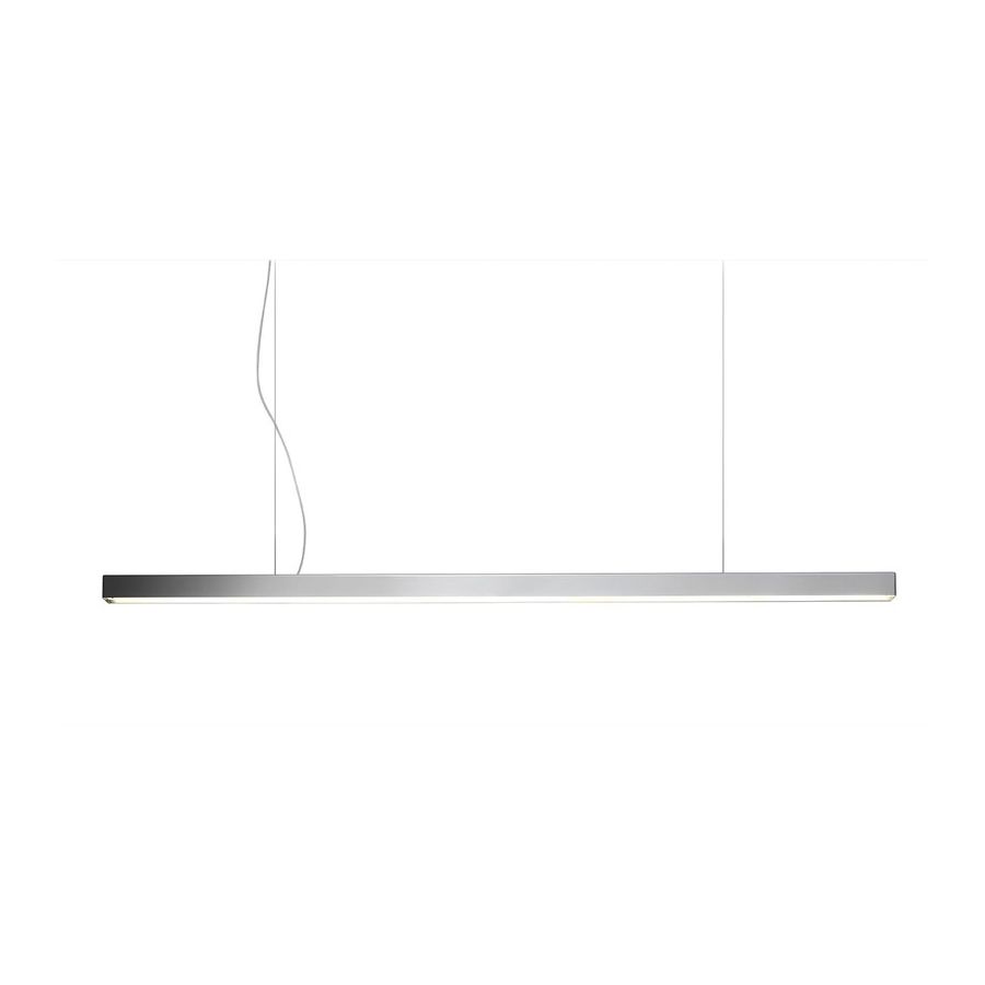 Polished Nikel square metal bar with LED lighting and polycarbonate diffuser. Strip led 17 W/m (tot 68W-3500 lumen) + internal power supply to the bar, steel cable on ceiling. Lighting item that diffuses the light with great effect in the surrounding environement creating a warm and welcoming atmosphere.
