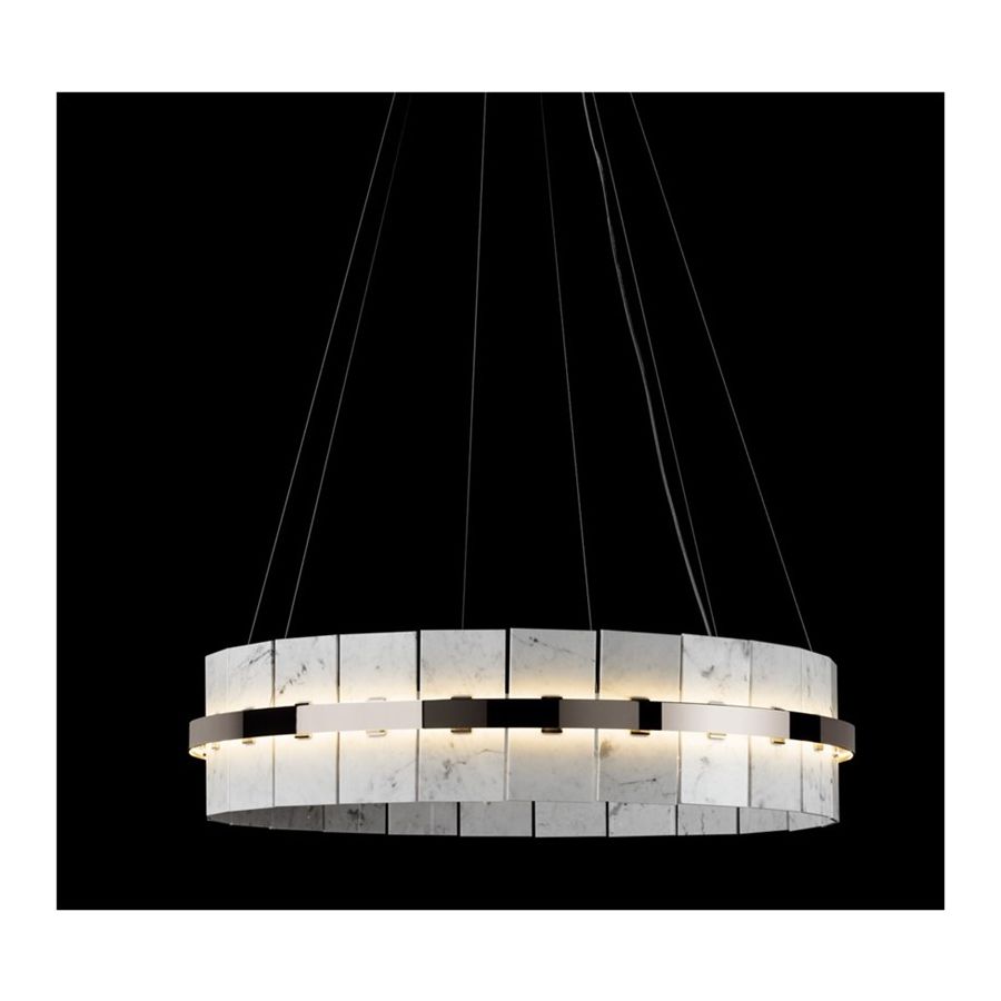 Round chandelier in brass with Carrara marble tiles. Lighting item that diffuses the light with great effect in the surrounding environement creating a warm and welcoming atmosphere.