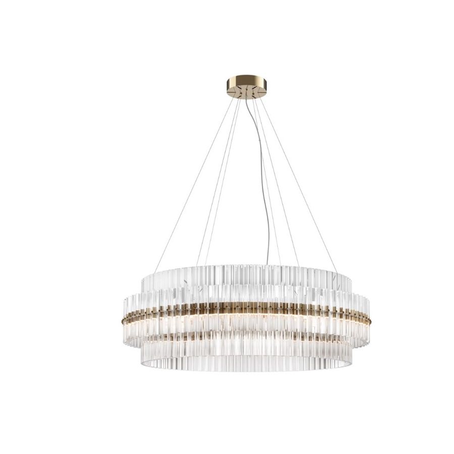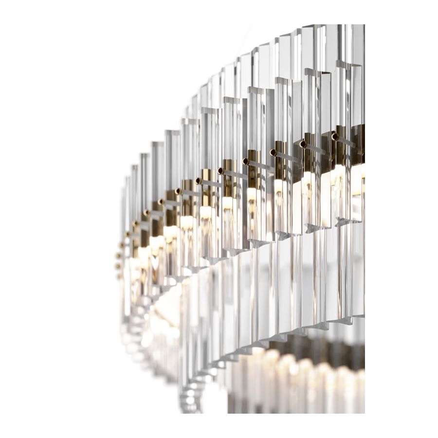 Round chandelier with double Triedro Glass. Lighting item that diffuses the light with great effect in the surrounding environement creating a warm and welcoming atmosphere.