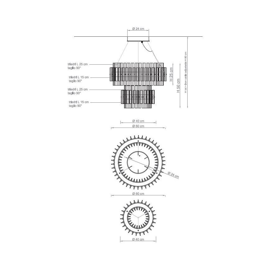 Coronis Chandelier A contemporary expression of timeless elegance and radiant light. The Coronis Chandelier embodies the perfect harmony between geometric precision and material refinement, designed for luxurious interiors such as living rooms, dining areas, and grand entrance halls. Its metal structure, enhanced by a 24K gold-plated galvanic finish, supports two luminous rings adorned with transparent glass trihedrons, each precisely cut at a 90° angle. These glass elements reflect and refract light, creating a mesmerizing interplay of brilliance and transparency that fills the space with elegance and airiness. The integrated high-efficiency LED strips diffuse a soft yet vibrant light along the circular frames, amplifying the purity of the glass and the warmth of gold. The result is a refined and enveloping glow, turning every setting into a scene of understated opulence. With a diameter of 60 cm and a height of 50 cm, Coronis combines harmonious proportions and scenic impact. Adjustable suspension cables allow for customized installation, while the dual luminous rings enhance architectural spaces with balance and sophistication. A true jewel of light, uniting glass artistry, Italian craftsmanship, and contemporary design in a perfect symphony of luxury and lightness.