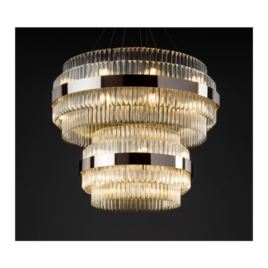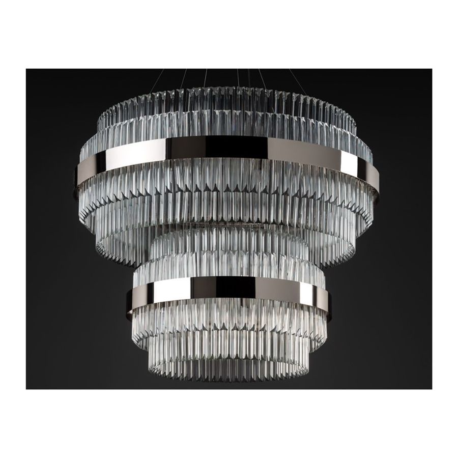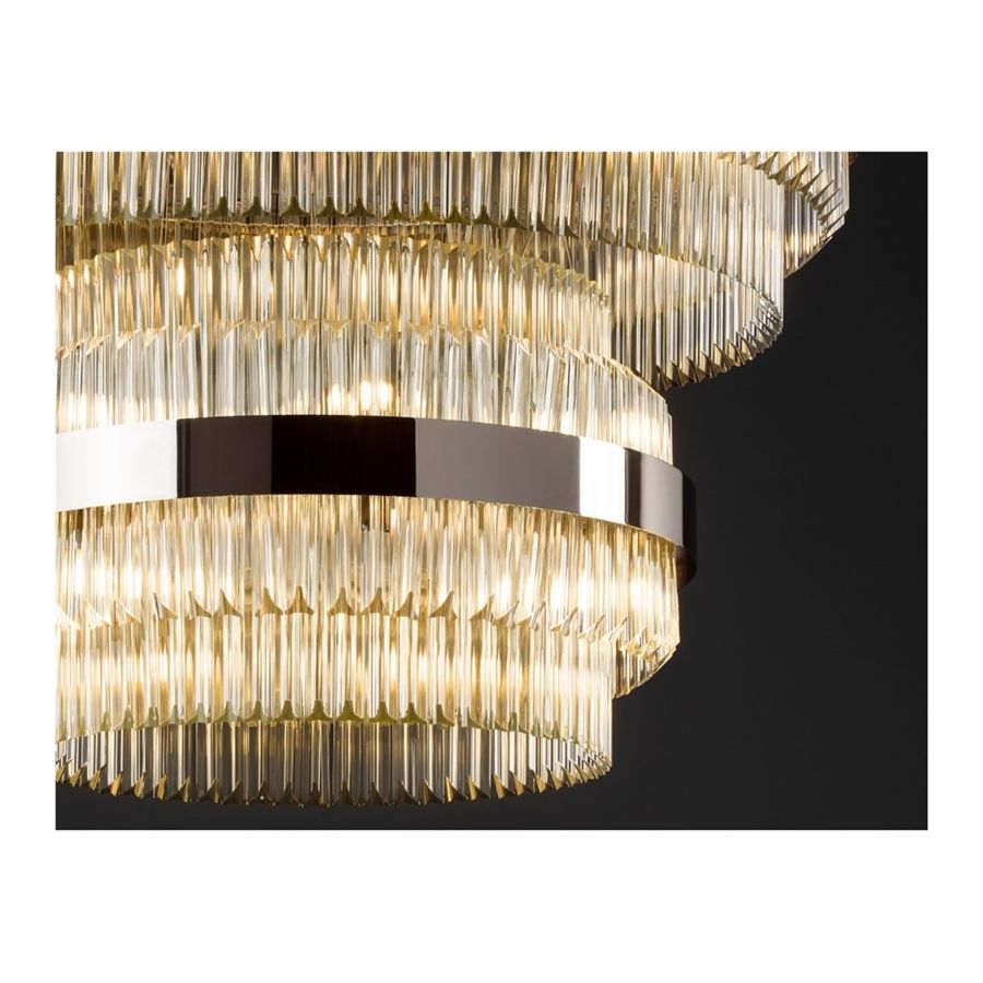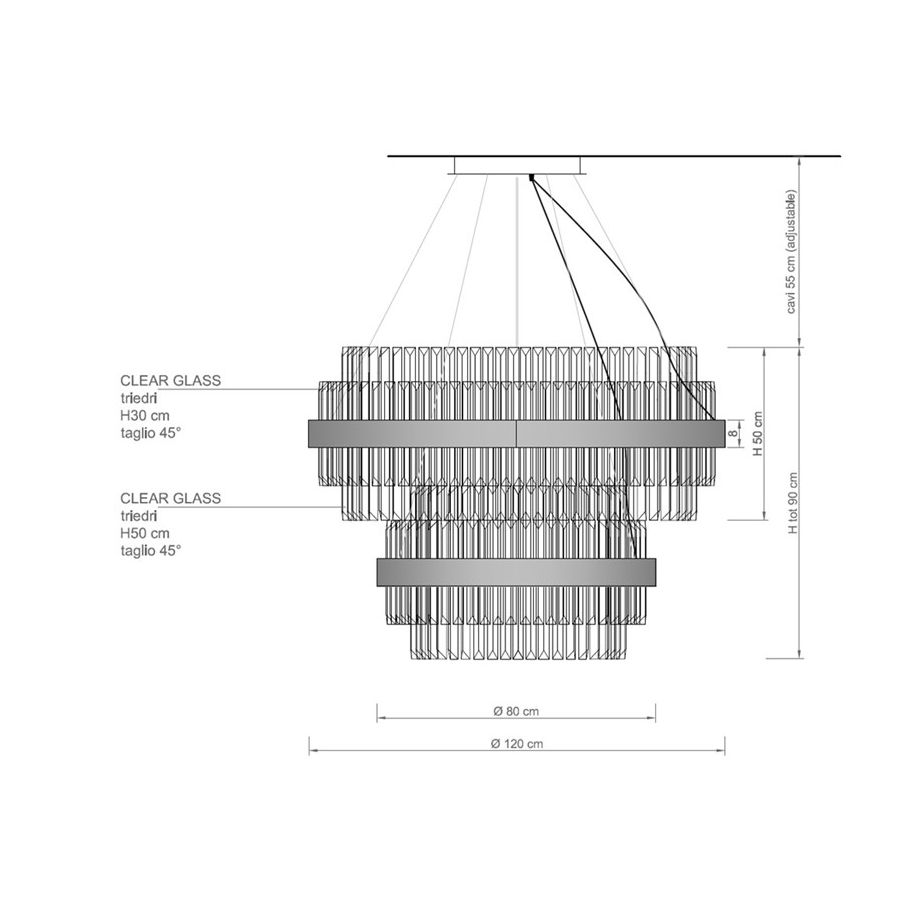 Chandelier with transparent trihedrons. Lighting fixture that diffuses the light into the surrounding environment with great effect, creating a warm and welcoming atmosphere. Shiny metallic band in Nikel color. Hooking system with adjustable steel cables.