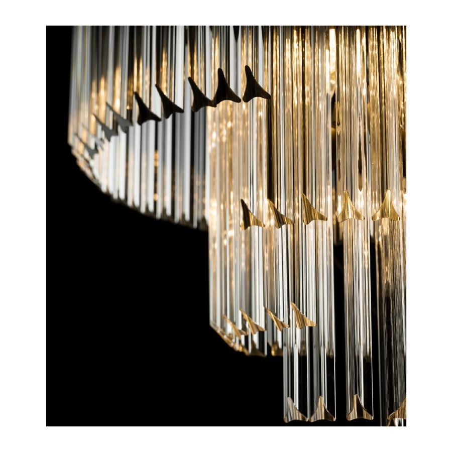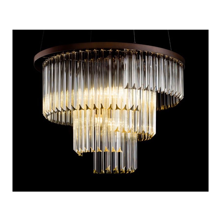 Round chandelier with Triedro Glass. Lighting item that diffuses the light with great effect in the surrounding environement creating a warm and welcoming atmosphere.