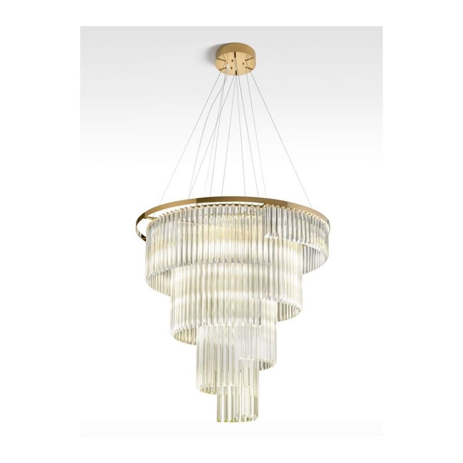 Timeless elegance transformed into light. The Regalis Chandelier is a creation of extraordinary charm and prestige, designed for grand spaces such as living rooms, halls, and reception areas. The metal structure, enhanced by a 24K gold-plated galvanic finish, gracefully supports a cascade of glass elements, shaped in the distinctive trihedral form with a 45° cut tip. Each glass element reflects and diffuses light in a unique way, creating a play of reflections and transparencies that fills the space with radiant sophistication. Balanced proportions and visual lightness make this chandelier a statement piece of elegance and style, combining grandeur with refined delicacy. With a diameter of 112 cm and a total height of 110 cm, the chandelier’s layered design exudes both scenic impact and perfect harmony. The 13 LED G9 light sources ensure brilliant, even illumination, highlighting the purity of the glass and the richness of the gold finish. A luminous masterpiece that celebrates the art of glass and metal in a symphony of light, refinement, and grace.