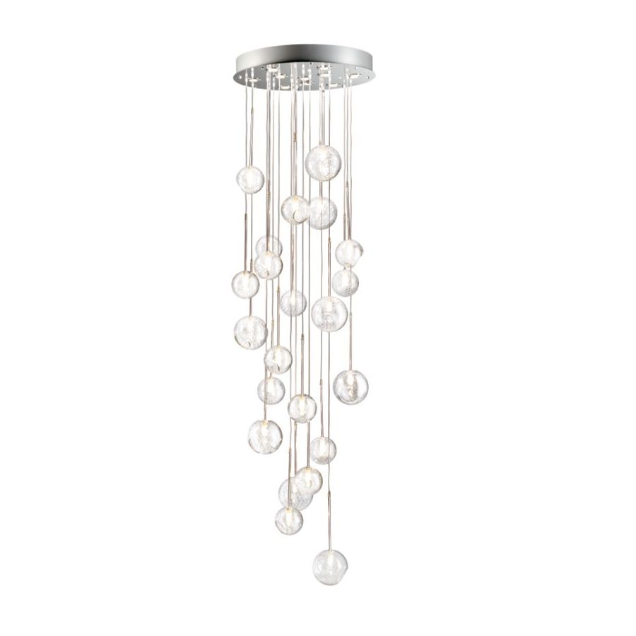 Cascade chandelier with clear crystal balls. Lighting item that diffuses the light with great effect in the surrounding environement creating a warm and welcoming atmosphere.