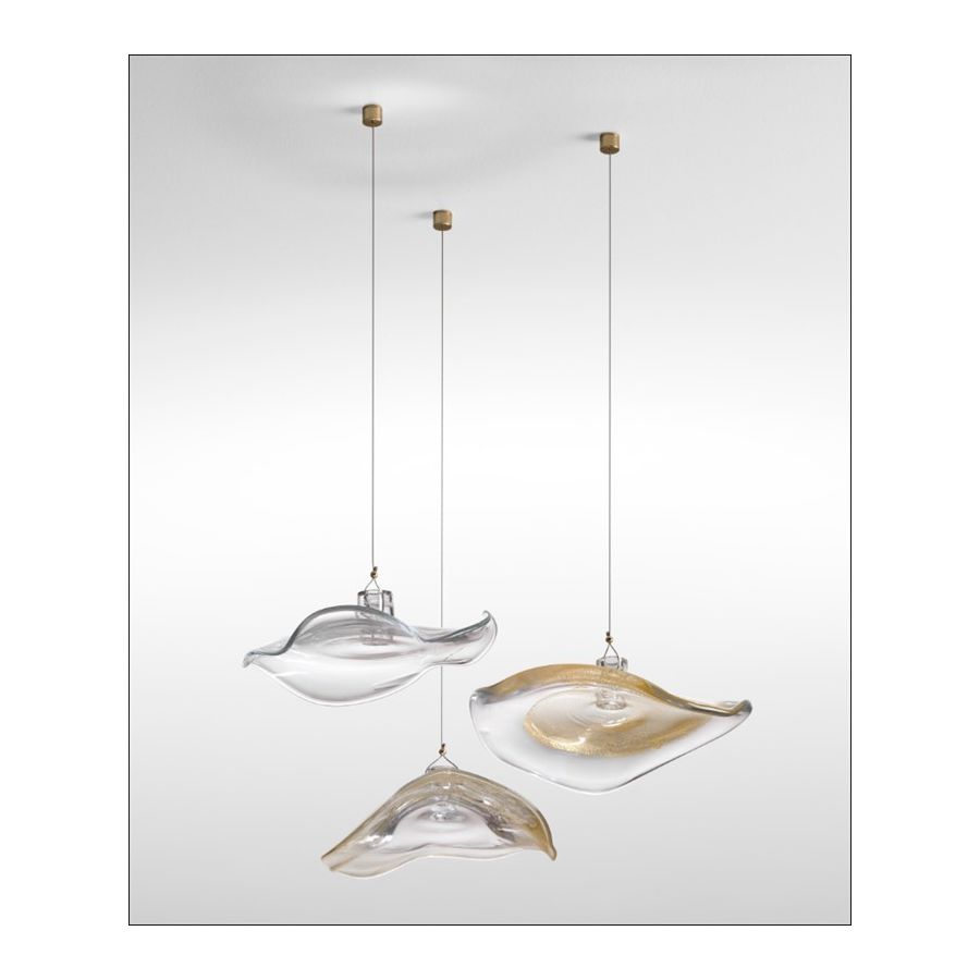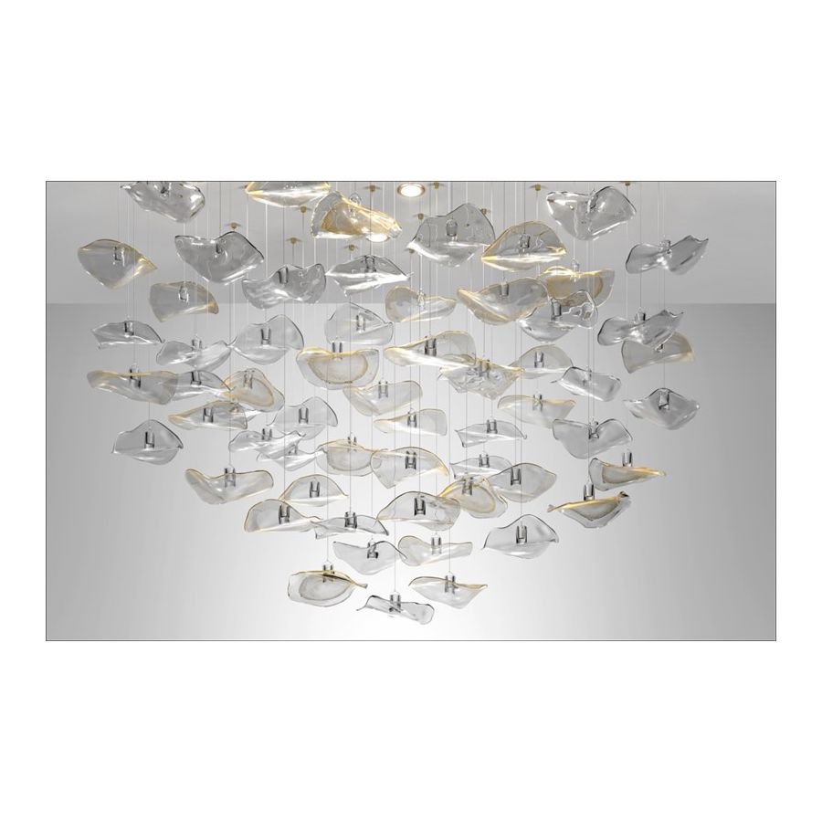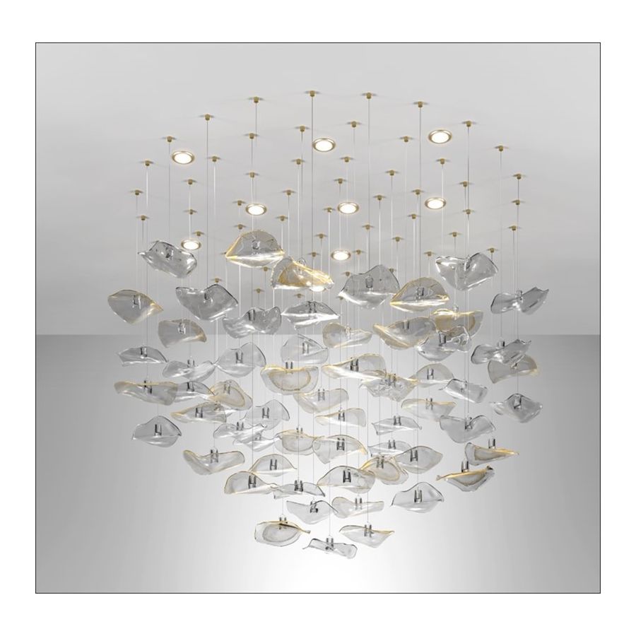 The chandelier is an elegant fusion of transparent and gold Murano glass discs, mounted directly to the ceiling without any visible metal plate. The transparency of the discs provides lightness and brightness, while the gold adds a touch of warmth. The suspended design creates an ethereal atmosphere, highlighting the beauty of the materials without metallic interferences. It is a luminous work of art that combines luxury and sophistication in ambient lighting.