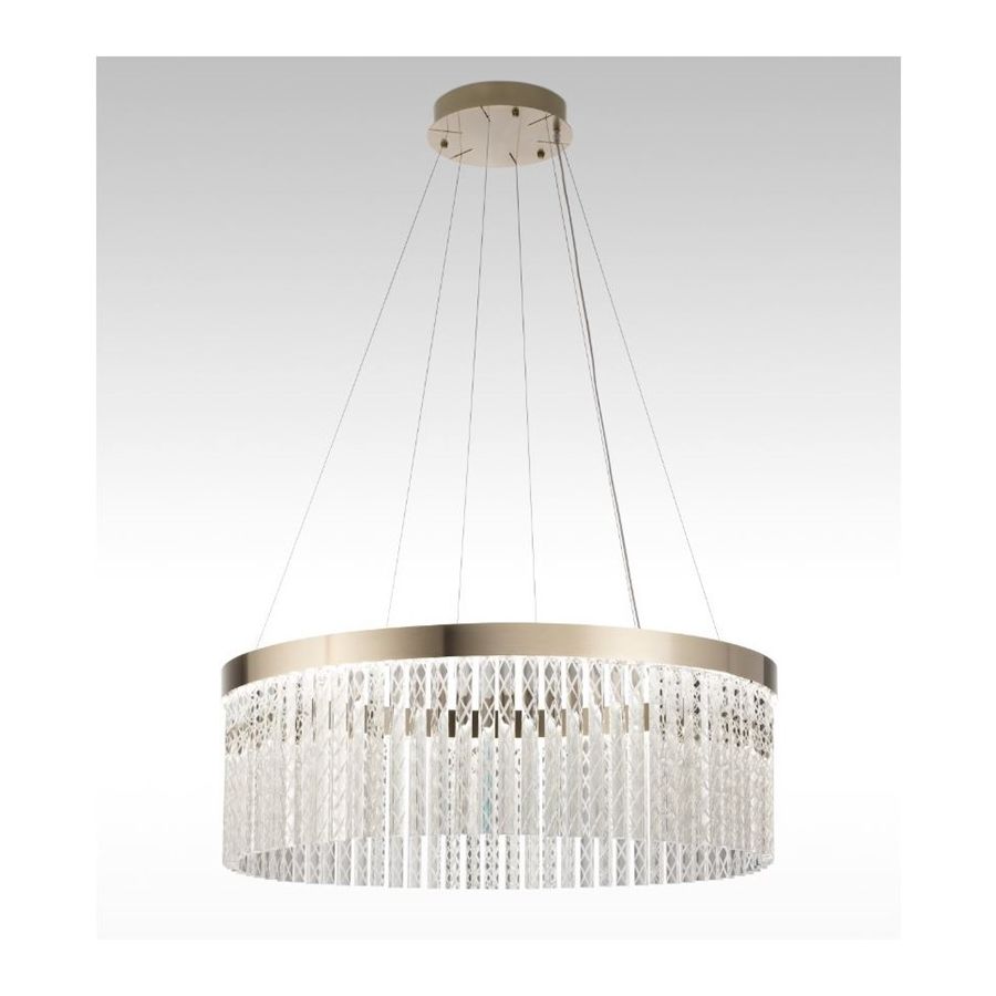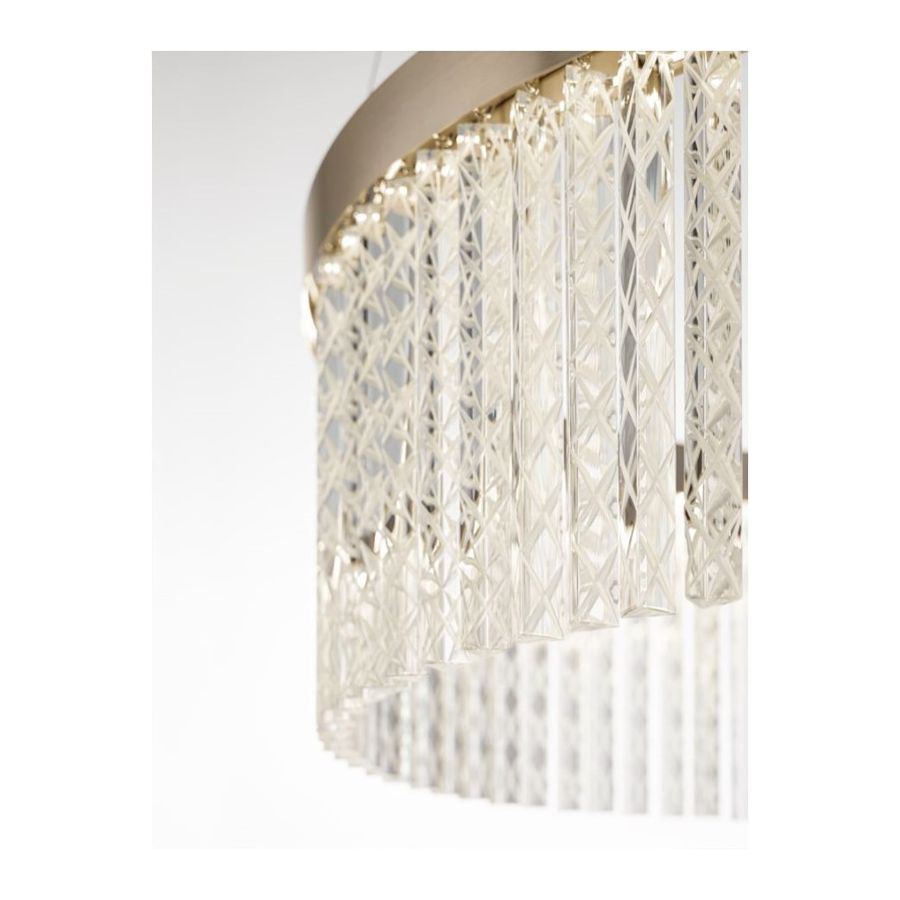 Add a touch of elegance to your home with this contemporary chandelier featuring a harmonious circular shape. Crafted with hand-engraved Triedro glass with a sophisticated diamond pattern, it creates a unique and enchanting lighting effect. The LED strip emits a soft and harmonious glow, while the reflections from the three-sided glass engraving produce a breathtaking play of light. Perfect for elegant and prestigious interiors, it is a true masterpiece of design and craftsmanship.