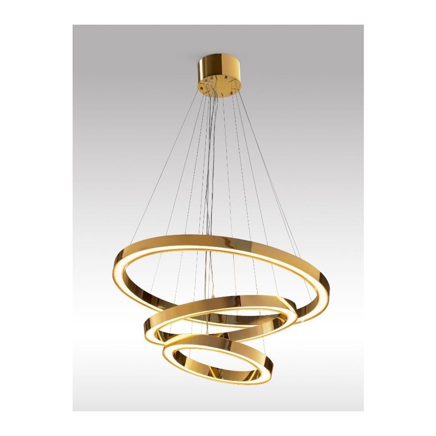 Galaxy – Circular Ring Chandelier Galaxy is a modern and striking chandelier composed of circular metal rings with a 24K gold finish, offering a refined and contemporary look. The rings can be adjusted in height using steel suspension cables, allowing you to create your own customized composition and a dynamic visual effect. The pre-installed LED strips emit a soft downward light, providing comfortable and pleasant illumination without glare. Available in other metal finishes upon request, to perfectly match different styles and interior designs. Dimensions: Maximum diameter Ø 100 cm (˜ 39.4”) Height 50 cm (˜ 19.7”) – adjustable via steel cables. A bold and sophisticated lighting statement, ideal for modern interiors, living spaces, and contract environments, where light becomes a form of art and movement.