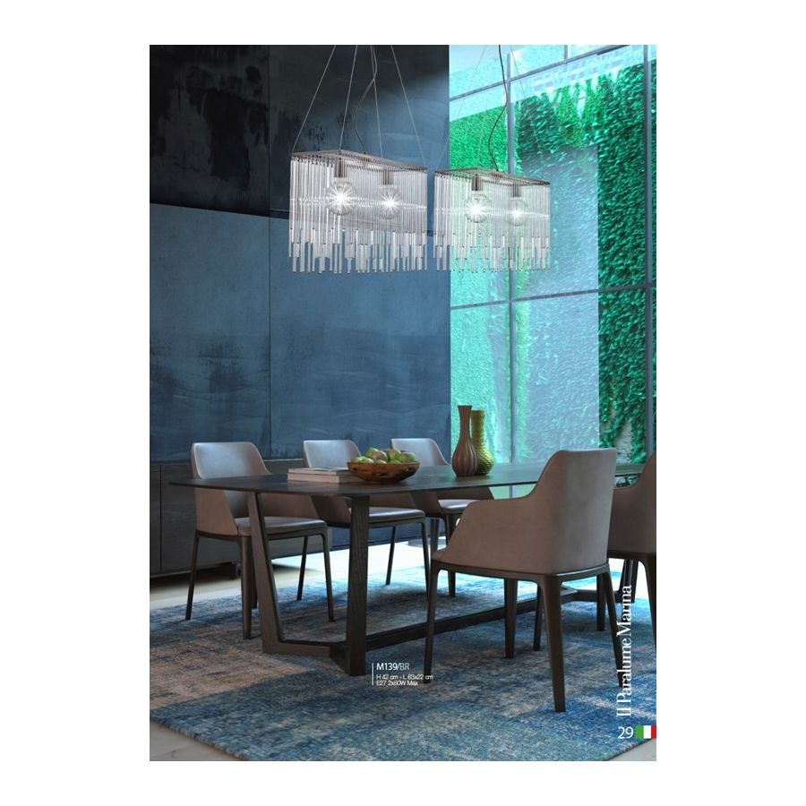 Chandelier with glass small tubes. Lighting item that diffuses the light with great effect in the surrounding environement creating a warm and welcoming atmosphere.