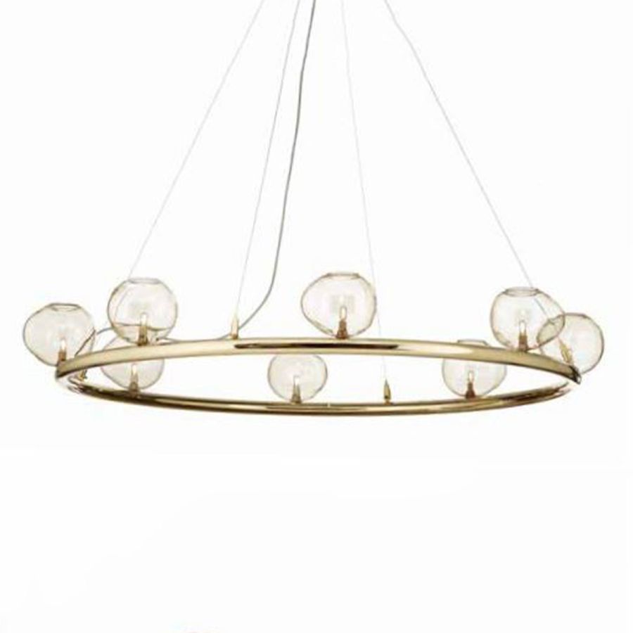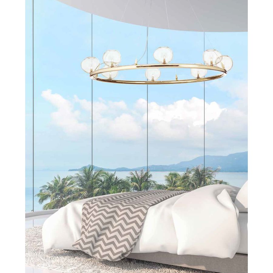 Metal ring chandelier with decorations in borosilicate glass. Lighting item that diffuses the light with great effect in the surrounding environement creating a warm and welcoming atmosphere.