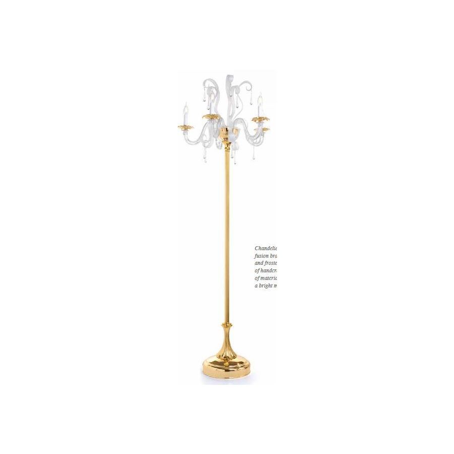 Floor Lamp 5 lights in cast brass with a castle of trasparent and sandblasted Murano glass elements. Lighting item that diffuses the light with great effect in the surrounding environement creating a warm and welcoming atmosphere.