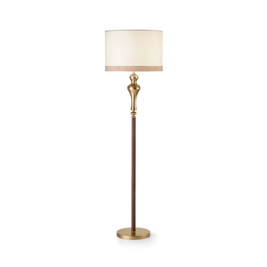 An elegant floor lamp that combines classic style with contemporary details. The stem is covered in eco-leather, enhanced by painted gold metal finishes (P-OV12) that add warmth and sophistication to any space. The light-colored fabric lampshade diffuses a soft, enveloping glow, ideal for creating a relaxing atmosphere in the living room, bedroom, or study. A refined furnishing element, perfect for those seeking a balance between elegance, comfort, and sustainability.