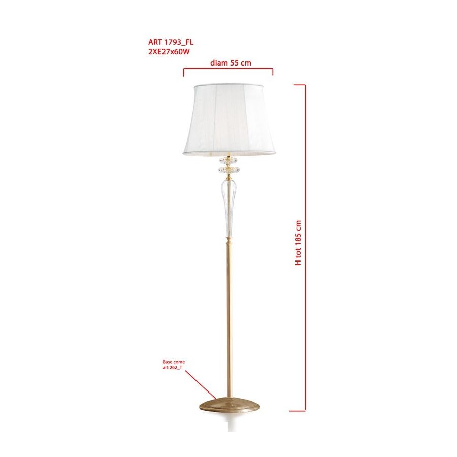 Amarillis Collection: Floor lamp in clear Murano glass with light ivory lampshade in double fabric with crystal trimming. Lighting item that diffuses the light with great effect in the surrounding environement creating a warm and welcoming atmosphere.
