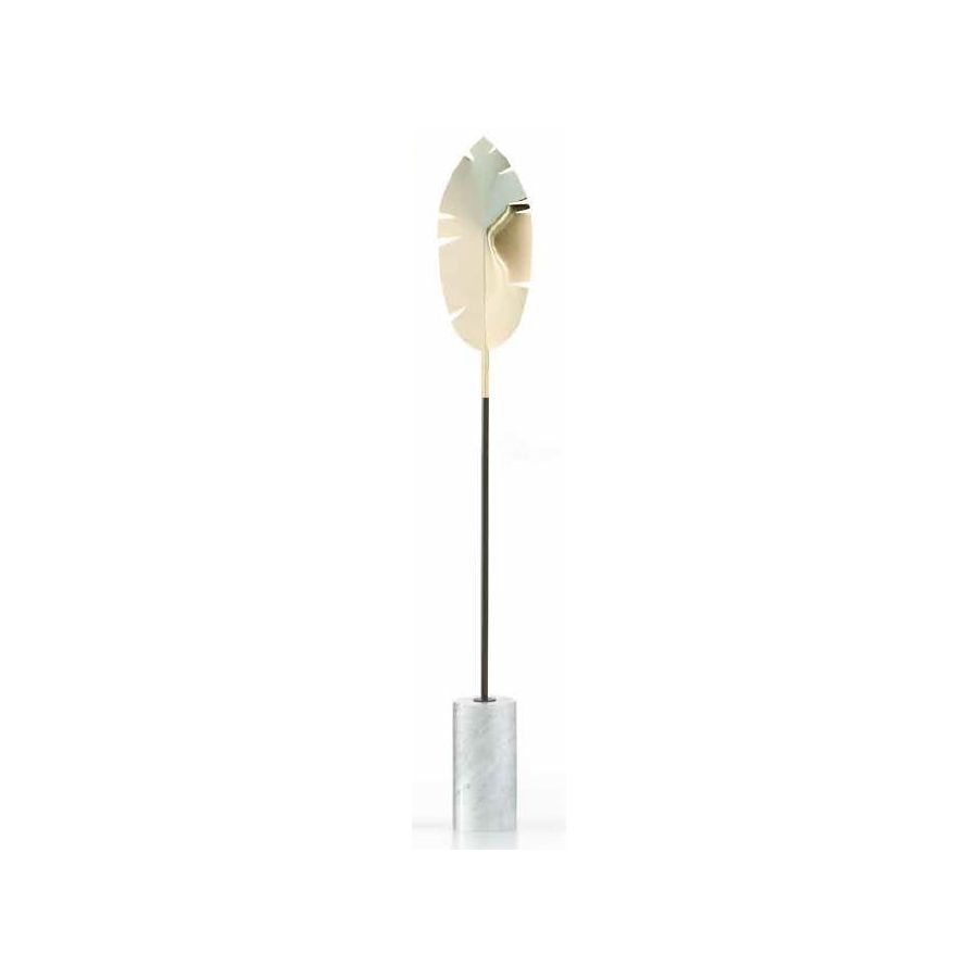Floor lamp with stlilized leaves in brushed soft gold outside and polished finish inside, on matt black metal structure and element in Carrara marble. Lighting item that diffuses the light with great effect in the surrounding environement creating a warm and welcoming atmosphere.