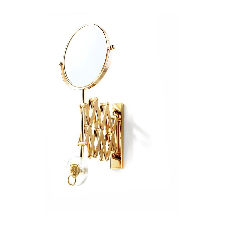 LIONS Wall mirror brass with magnifying (2X) in polished gold and with casting brass Lion and glass medallion. Functional elements that create an extremely elegant, welcoming and high-value bathroom.