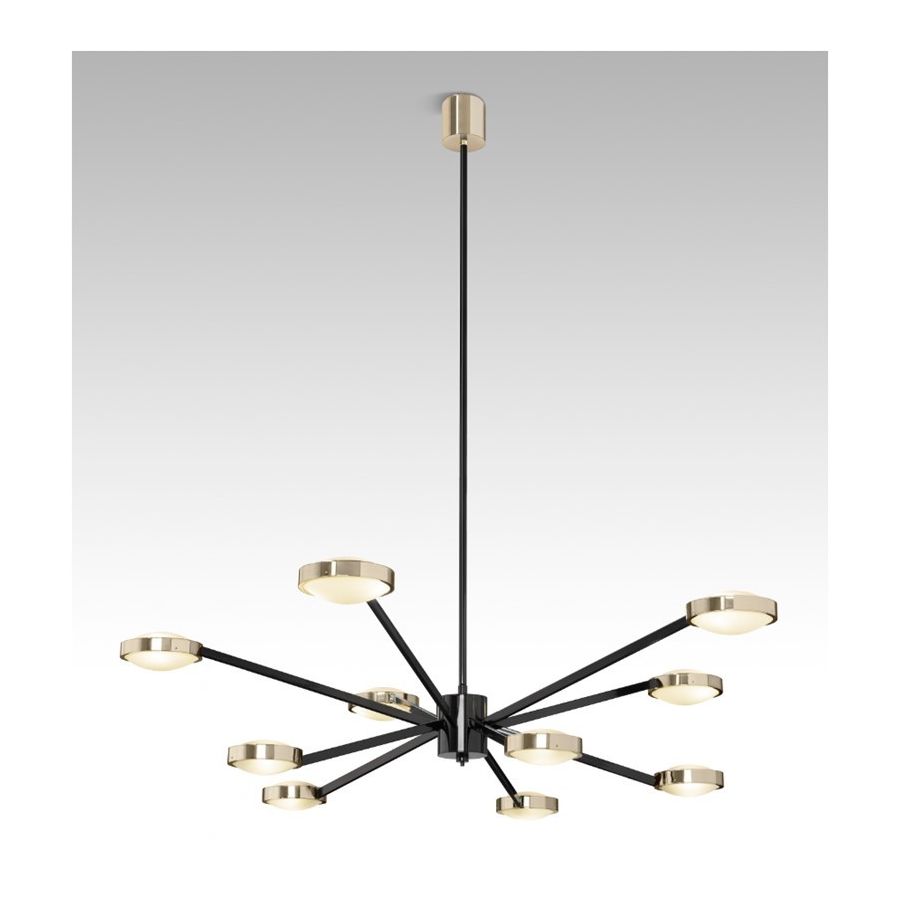 The sumptuous large chandelier with a diameter of 213 cm is a striking creation that appears to float in the air. Ideal for grand entrances, hotel lobbies, and villas, this chandelier boasts a contemporary style with captivating contrasting colors. The combination of black paint and polished brass, inspired by Art Deco style, adds a touch of elegance and modernity.
