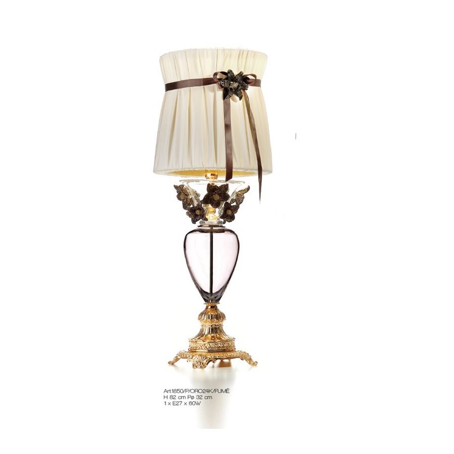 Table lamp in smoky Florentine crystal and cast brass. Decorated with black & gold Murano glass flowers. and lampshade in double fabric with brown ribbon and glass flower. Lighting item that diffuses the light with great effect in the surrounding environement creating a warm and welcoming atmosphere.