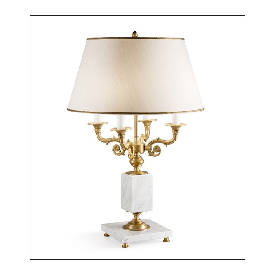 An Empire-style lamp with a white Carrara marble base and brass components, complete with an ivory shantung lampshade, can be customized for both the type of marble and the lampshade fabric. This piece of furniture embodies elegance and luxury, diffusing a soft light and creating a cozy atmosphere.