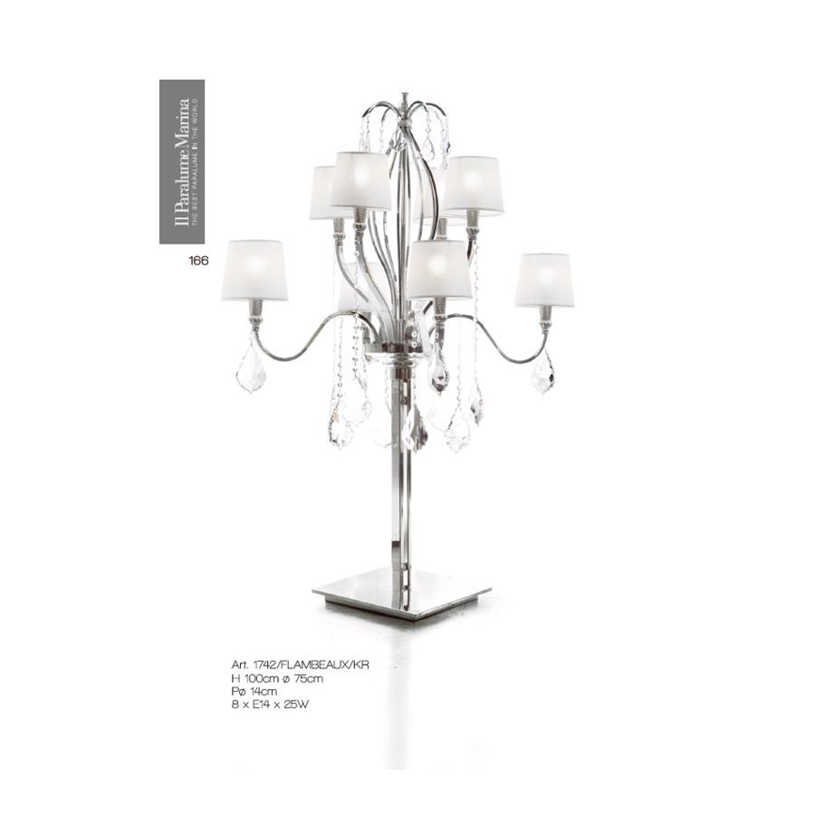 Chrome flambeaux with Swarovski® crystal pendants, rhinestones and white lampshades on pvc. Lighting fixture that diffuses the light into the surrounding environment with great effect, creating a warm and welcoming atmosphere.