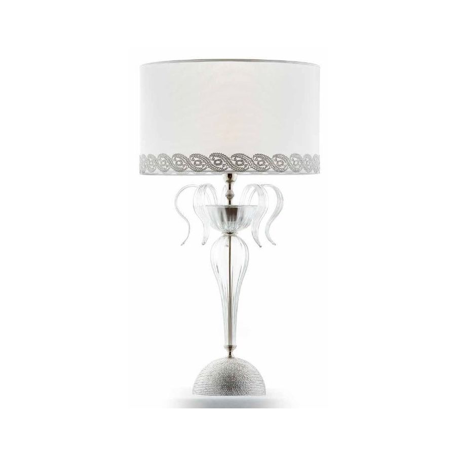 NINFEA Collection Table Lamp in Murano glass with brass elements inlaid with Swarovski® strass crystals. Included lampshade in white organza with fabric trimming. Lighting item that diffuses the light with great effect in the surrounding environement creating a warm and welcoming atmosphere.