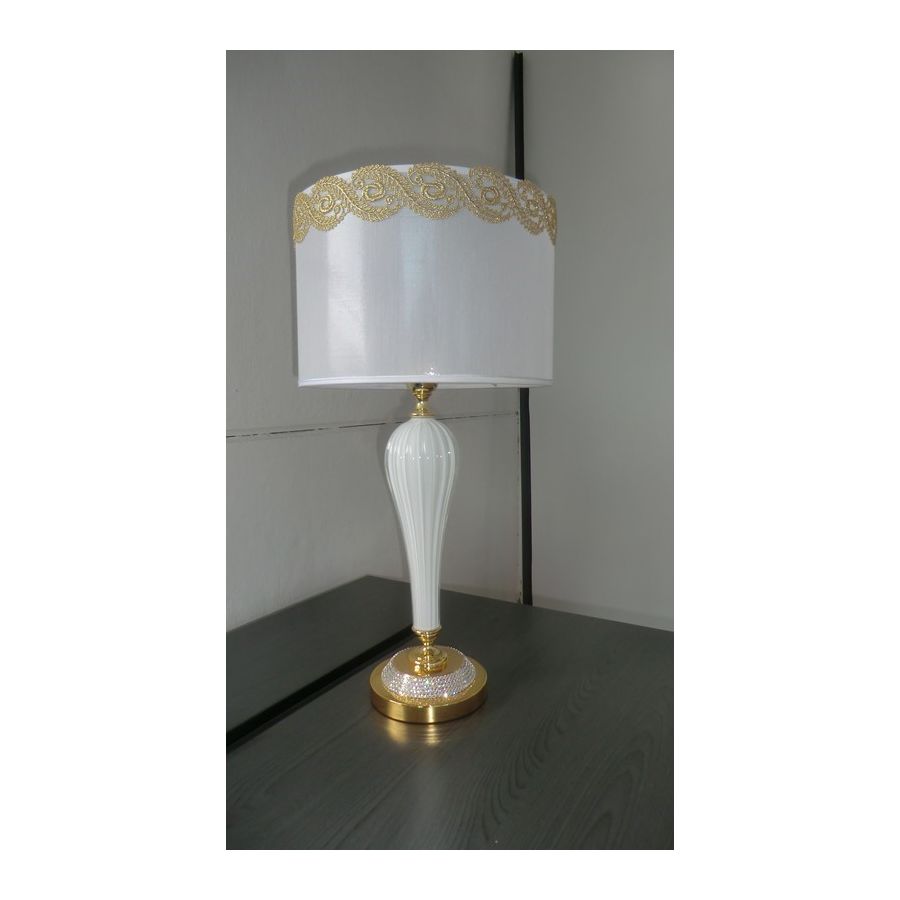 NINFEA Collection Table Lamp in Murano glass with brass elements inlaid with Swarovski® strass crystals. Included lampshade in white organza with fabric trimming. Lighting item that diffuses the light with great effect in the surrounding environement creating a warm and welcoming atmosphere.