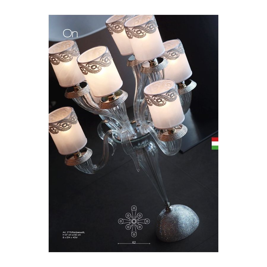 NINFEA Collection Table lamp/Flambeaux 8 lights in Murano glass with brass elements inlaid with Swarovski® strass crystals. Included lampshades in white organza with fabric trimming. Lighting item that diffuses the light with great effect in the surrounding environement creating a warm and welcoming atmosphere.