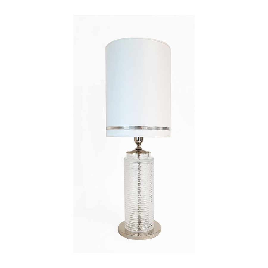 Transparent Table lamp in Florentine crystal with white lampshade. Lighting item that diffuses the light with great effect in the surrounding environement creating a warm and welcoming atmosphere.