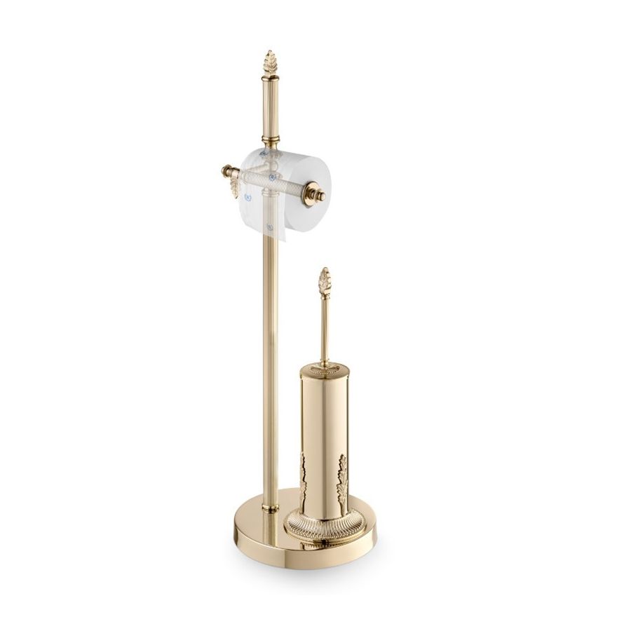 SMERALDO The bathroom floor stand is an exquisite blend of premium materials and sophisticated design, perfect for high-end bathrooms. Crafted with brass plated in gold, it adds a touch of luxury and refinement to the environment. The swiveling toilet paper holder, carefully placed in the stand, offers an elegant practicality. The toilet brush, also in golden brass, seamlessly integrates into the set, further accentuating the prestige of the bathroom. This piece of furniture not only meets functional needs but transforms the bathroom into a space of refined beauty and comfort, ideal for those seeking a high-quality experience.