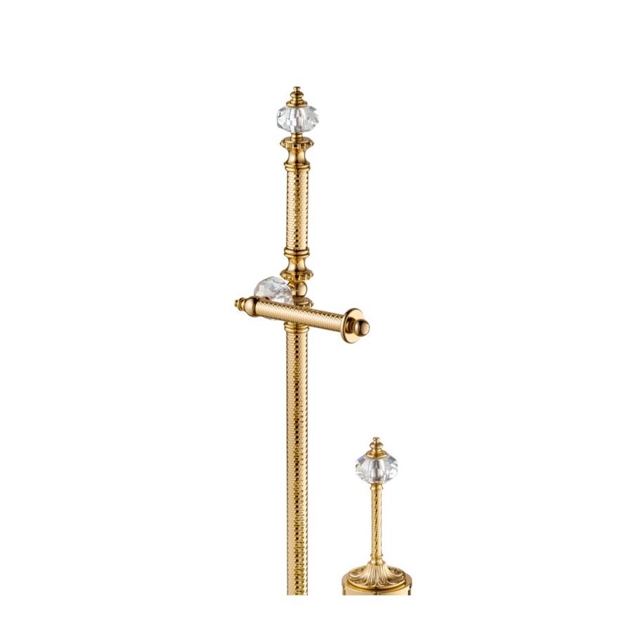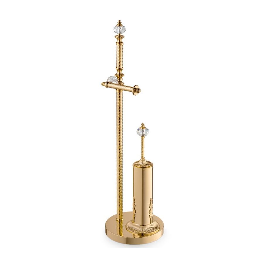PYTHON The bathroom floor stand is an exquisite blend of premium materials and sophisticated design, perfect for high-end bathrooms. Crafted with brass plated in gold, it adds a touch of luxury and refinement to the environment. The swiveling toilet paper holder, carefully placed in the stand, offers an elegant practicality. The toilet brush, also in golden brass, seamlessly integrates into the set, further accentuating the prestige of the bathroom. This piece of furniture not only meets functional needs but transforms the bathroom into a space of refined beauty and comfort, ideal for those seeking a high-quality experience