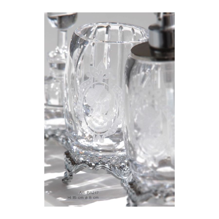 Toothbrush holder in clear Italian crystal with hand-carved lady portrait cameo and chrome brass element base. Functional elements that create an extremely elegant, welcoming and high-value bathroom.