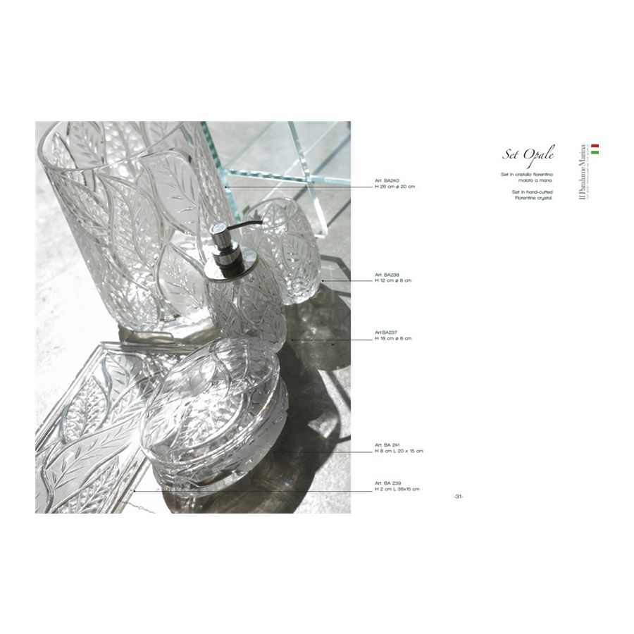 Thoothbrush holder in italian hand-cutted crystal with transpaent and frosted leaves image. Functional elements that create an extremely elegant, welcoming and high-value bathroom.